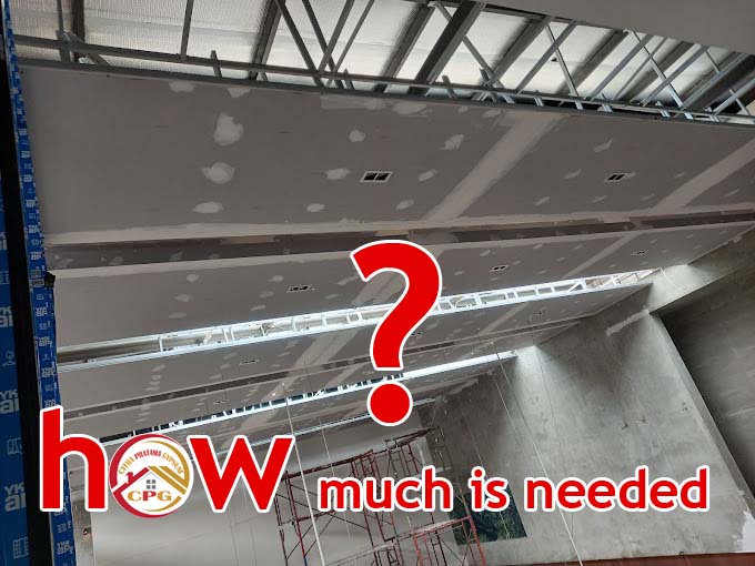 Umumnya, lembaran gypsum berukuran 120 cm x 240 cm atau 2,88 m² per lembar. Hitung jumlah lembaran gypsum yang diperlukan dengan membagi total luas plafon dengan luas satu lembar gypsum:
